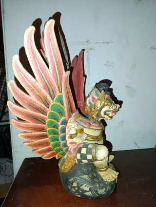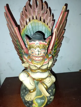 Figura de estilo balinés, ideal para añadir un toque exótico a tu hogar. Representa una criatura mítica con alas y detalles coloridos. - Elaborada en madera. - Pintura multicolor con detalles dorados. - Base decorativa con motivos florales.
