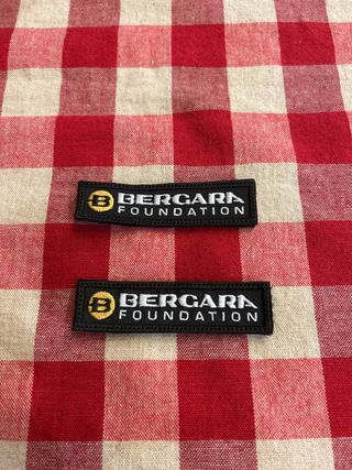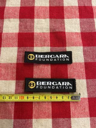 Dos parches bordados de la Bergara Foundation. - Diseño con logo y texto. - Color negro con detalles en dorado y blanco. con doble belcro
