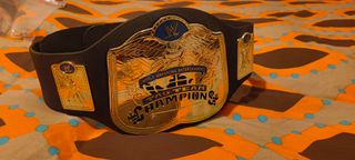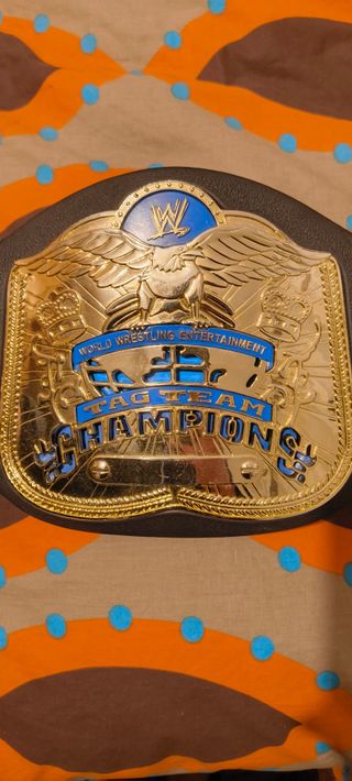 Réplica del cinturón de Campeones de Parejas de la WWE. - Diseño dorado con detalles en azul. - Inscripción World Wrestling Entertainment Tag Team Champions. - Placas laterales con el logo de la WWE.