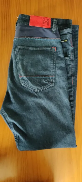 Pantalón Millet Trilogy Cordura Denim. En muy buen estado, con poco uso y sin desperfectos. Material ligero, cómodo y resistente. Zona de las rodillas preformadas. Detalles de costuras en azul y rojo. Válidos para actividades de montaña o urbanos. Talla M de hombre