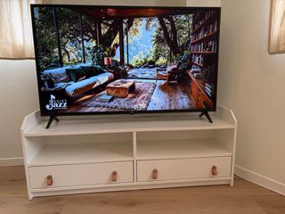 Mueble de televisión con un diseño moderno y funcional. - Amplio espacio de almacenamiento. - Estructura robusta y estable.