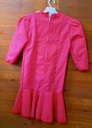 Disfraz de chulapa en color rojo con lunares blancos. Marca Partilandia. - Diseño de manga larga. - Adornado con encaje y lazos blancos. - Falda con volantes. Incluye como extras el pañuelo blanco y el mantón rojo. Talla 6 años. Impecable, puesto sólo 1 vez. Con embalaje original. Envío o entrega en mano zona Collado Villalba, Moralzarzal, etc.