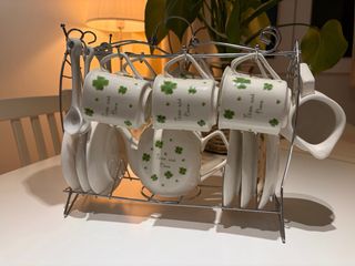 Elegante juego de Café/Te con tazas y platos. - Diseño con tréboles verdes y texto Time and Place. - Soporte metálico para organizar las piezas. - Incluye cucharillas.