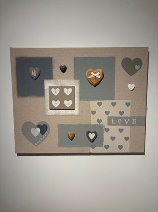 Precioso cuadro decorativo de Le Maison du Monde con temática de corazones. - Diseño con parches de tela y detalles en madera. - Motivos de corazones en diferentes tamaños y texturas. - Incluye la palabra LOVE y Bonheur.