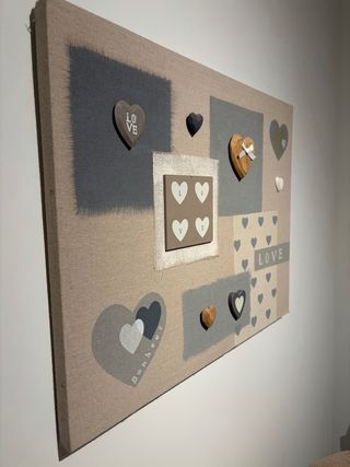 Precioso cuadro decorativo de Maison du Monde, perfecto para añadir un toque especial a tu hogar. - Diseño con corazones y escritura. - Combinación de materiales como metal, mimbre y madera.