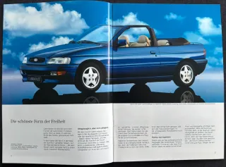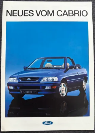 Catálogo original del Ford Escort Cabriolet de 1993. Presenta el diseño y características del modelo. - Portada con el lema Neues vom Cabrio. - Imagen del Ford Escort Cabriolet azul. - Incluye el logo de Ford.