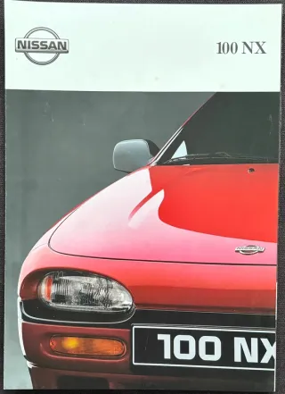 Catálogo original del Nissan 100 NX de 1990. Presenta el diseño deportivo del vehículo. - Portada con imagen del frontal del coche. - Incluye el logo de Nissan.