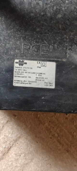 Caja de protección industrial PCE. - Referencia: 0774 700 008 - Tipo: 94741128wu - Tensión: 230/400V~ - Corriente nominal: 32A - Frecuencia: 50Hz - Dimensiones: 320x320x320 mm - Peso: 9.30 kg - Tipo de corriente: AC - Fecha de producción: 08/07