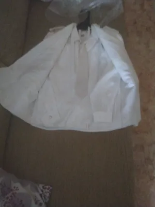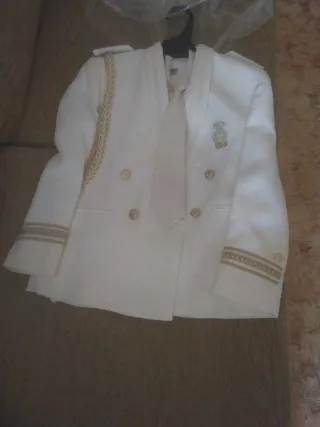 Conjunto completo para comunión en color blanco. Se encuentra en buen estado. - Chaqueta con detalles dorados. - Corbata a juego. - Insignia en la solapa.