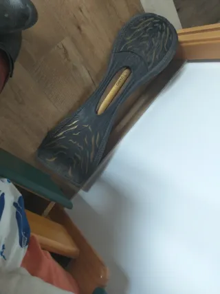 Patineta de dos ruedas con diseño deportivo. - Base negra con detalles dorados. - Eje central visible.