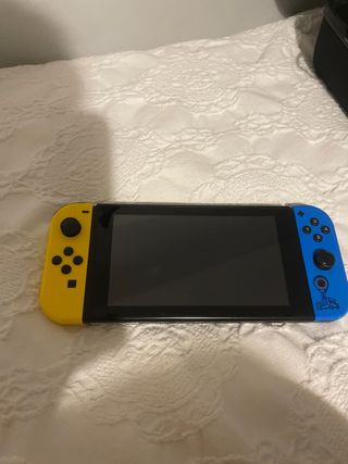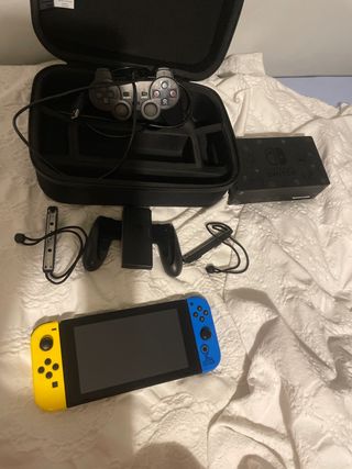 Consola Nintendo Switch con Joy-Cons en colores azul y amarillo. Incluye base de carga y funda. - Base de carga para Joy-Cons. - Funda de transporte negra. - Mando adicional.