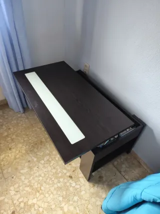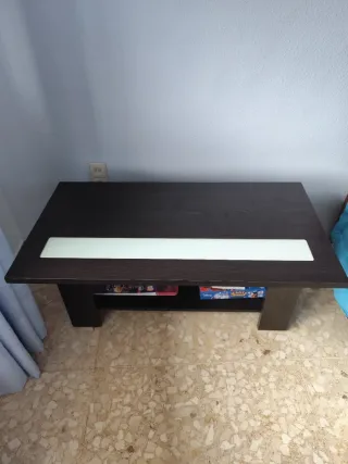 Mesa de centro con un diseño moderno y funcional, ideal para tu salón. Combina la calidez de la madera con un toque de elegancia. - Acabado en color wengué. - Detalle superior en cristal blanco.