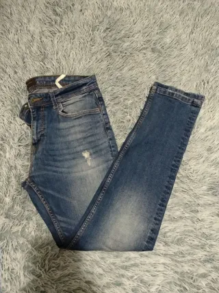 Pantalón vaquero estilo skinny de Bershka. Un básico para tu armario. Talla 40 Esta como nuevo - Diseño desgastado con rotos. - Tiro medio. - Cierre de cremallera y botón.