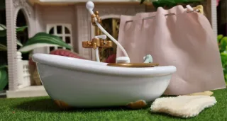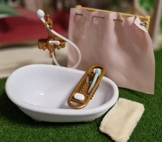 Set de ducha para muñecos Sylvanian Families. Incluye bañera, ducha, accesorios y cortina. - Bañera blanca. - Ducha dorada con manguera. - Accesorios de baño. - Cortina de ducha rosa.