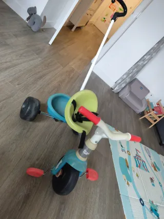 Triciclo infantil con asiento y pedales. - Asiento de color verde con arnés de seguridad. - Rueda delantera con pedal. - Mango de empuje para adultos.