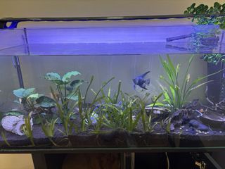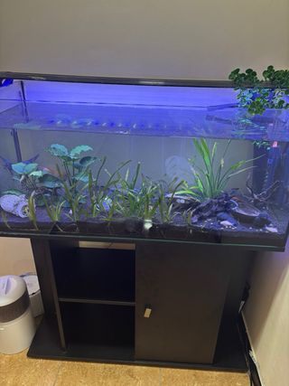 Acuario o pecera completo, listo para instalar. - Incluye mueble negro. - Iluminación LED azul. - Plantas acuáticas incluidas. - Decoración rocosa. -Mucho más. Escuchó ofertas.