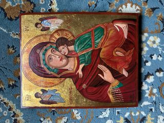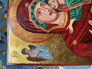 Hermoso icono ruso antiguo, una representación de la Virgen María con el Niño Jesús. La pieza está adornada con pan de oro y completamente pintada a mano. Hecha por mi abuela a mano, hay mas piezas por si alguien quiere verlas, escribidme sin compromiso. Pan de oro y pintado con detalles todo por ella, madera antigua tratada por ella tambien. Autora: Amparo Miguel