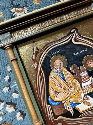 Icono religioso ruso antiguo, con detalles dorados y marco de madera. - Representación de figuras religiosas. - Marco de madera con detalles ornamentales. Hecho a mano completo desde cero, tratada la madera y pintado por mi abuela. Hay mas obras por si alguien quiere verlas sin compromiso. Hecho con mucho detalle y cariño, cualquier cosa preguntarme, y si quereis ella puede contaros el proceso de trabajo y cualquier cosa.