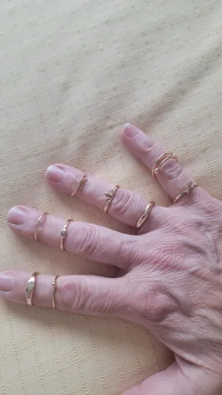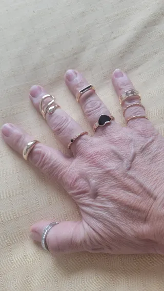Conjunto de varios anillos con diseños variados. Precio por unidad. - Anillos con diversas medidas - Combinación de tonos dorados y plateados. - Diseños modernos y elegantes.
