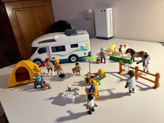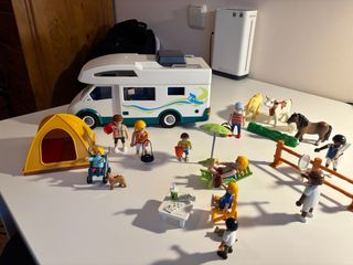 Conjunto de figuras y accesorios de Playmobil para recrear escenas de camping. - Incluye caravana. - Figuras de personas y animales. - Tienda de campaña. - Mobiliario de exterior.