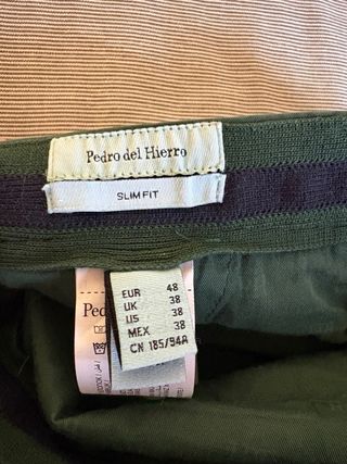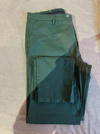 Pantalón chino Pedro del Hierro, color verde botella, talla 48. Muy poco uso, en excelente estado. Color elegante y menos común, queda muy bien con camisas claras o jerséis neutros. Lo vendo porque ya no uso esta talla. • Marca: Pedro del Hierro • Talla: 48 • Color: Verde botella • Tipo: Chino Entrega en mano en la Comunidad de Madrid. Si necesitas más información o medidas, escríbeme.