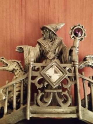 Pisapapeles con diseño de bruja. - Figura detallada de bruja con sombrero. - Incluye bastón con gema. - Base con dragones y detalles ornamentales. - Adorno con piedra central. -Tamaño aproximadamente de una manzana.