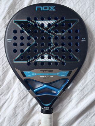Pala de pádel NOX AT10 Pro Cup Soft, diseñada para un juego de control y potencia. usada dos partidos, solo tiene un picotazo de una caída pequeño como se aprecia en la foto, está perfecta para su uso a mi se me hizo muy blanda - Marco de carbono. - Goma HR3 Soft. - Acabado mate.