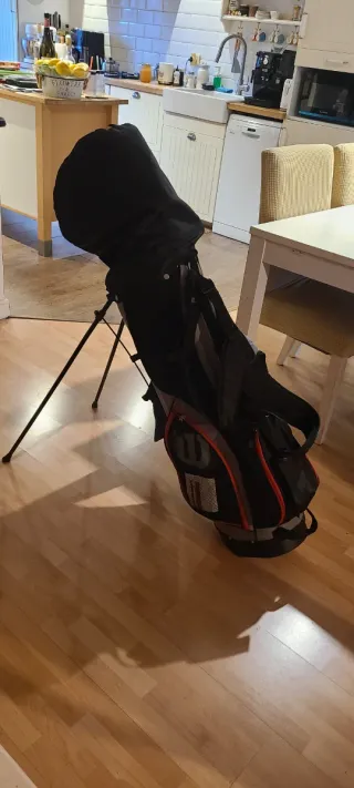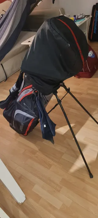 Bolsa de palos de golf Wilson en color negro y detalles en rojo - Diseño con trípode. - Múltiples compartimentos para palos y accesorios. - Correa ajustable para el hombro.