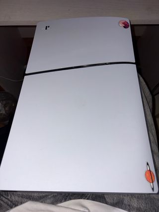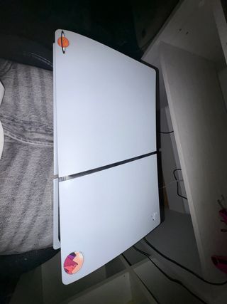 Consola PlayStation 5 Slim en color blanco. Incluye dos pegatinas decorativas. - Diseño moderno y elegante. - Pegatina de planeta con anillos. - Pegatina abstracta con tonos morados y naranjas. - con juegos incluidos fc26 call of duty y mas de varios juegos incluidos