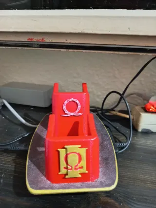 Soporte para dos mandos de PS5. - Diseño en color rojo. - Adorno con símbolo Omega en dorado y rojo Echo en 3D y pintado a mano 👌🏻