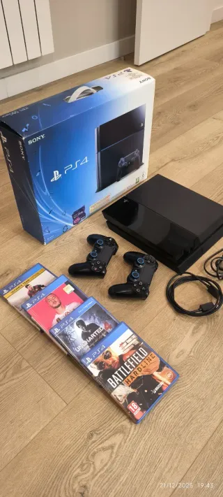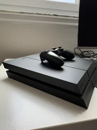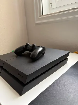 Consola PlayStation 4 en color negro, junto con su mando. - Mando incluido. - Presenta marcas de uso.
