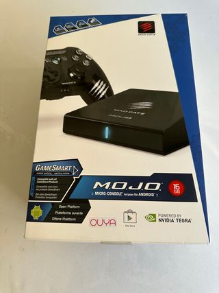 Micro-consola Mad Catz MOJO en color negro, diseñada para juegos en Android. Es compatible con productos GameSmart. - Incluye mando. - Potenciada por NVIDIA TEGRA. - Plataforma abierta. - Capacidad de 16 GB. - Se incluye con caja original y accesorios