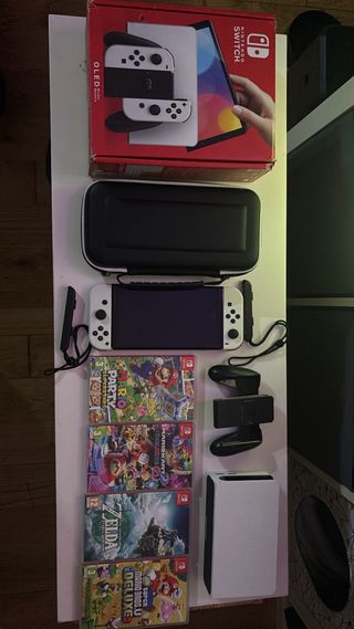 Consola Nintendo Switch OLED en color blanco, con todos sus accesorios originales. - Incluye: consola, cables, Joy-Cons, base de carga, funda protectora, cristal templado en la consola y otro a mayores nuevo Los juegos se venden por separado: -Mario Party Superstars 35€ -Mario Kart 8 Deluxe 45€ -The Legend of Zelda Tears of the Kingdom 40€ -Super Mario Bros U Delux 30€