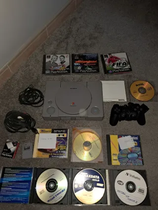 Lote de consola PlayStation 1 (PS1) en color gris, junto con varios juegos y accesorios.la consoka no funciona no se mueve donde ancla el juego pero si enciende todo lo demss funcional con tres juegos originales cables mando y dos memory card. - Consola PlayStation 1 (PS1) - Mando de control - Juegos: FIFA 2000, Motorhead, Superstars 98, Ferrari F355 Challenge, Mission Impossible, Metal Azo, Medal of Honor 2 - Tarjeta de memoria - Varios CDs grabables (RAXDATA GOLD, Benq, Verbatim)