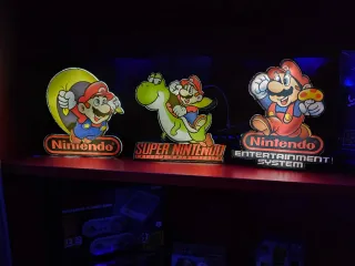 Conjunto de tres lámparas decorativas LED con personajes de Nintendo. - Diseño de Mario Bros con Yoshi. - Diseño de Mario Bros con un caparazón. - Diseño de Mario Bros con un champiñón.