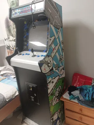 Máquina arcade recreativa con diseño temático de naves espaciales y temática retro. - Panel de control con joysticks y botones. - Monedero. - Gráficos coloridos en los laterales. Medidas 162cm de alto x 48cm de fondo x 55cm de ancho multitud de juegos arcade antiguos