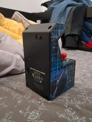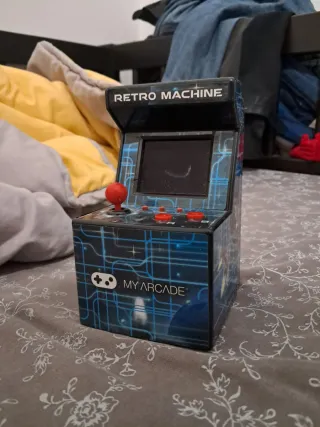 Pequeña máquina arcade de estilo retro, perfecta para coleccionistas o para añadir un toque nostálgico. - Diseño compacto y portátil. - Pantalla integrada. - Joystick y botones de control. - Funciona con pilas