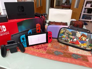 Consola Nintendo Switch con accesorios. - Incluye funda temática de Super Mario Odyssey. - Incluye cargador. - Joy-Con de color azul y rojo.