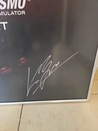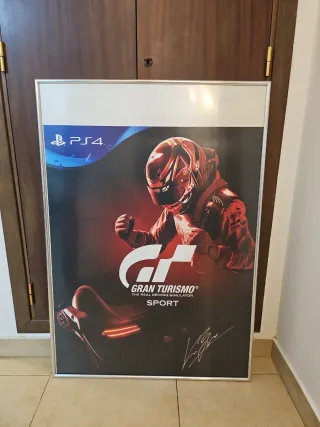 Póster promocional del videojuego Gran Turismo Sport para PS4. - Diseño con piloto y coche deportivo. - Firma original visible en la parte inferior derecha. - Marco plateado incluido. Kazunori Yamauchi, creador de Gran Turismo. #ps4 #publicidad #sony #granturismo