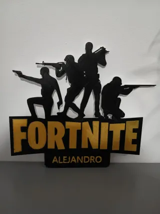 Decoración temática de Fortnite con siluetas de personajes y el nombre ALEJANDRO. - Diseño con figuras de soldados en acción. - Texto FORTNITE en letras doradas. - Nombre ALEJANDRO personalizable.