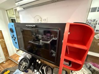 mueble/mando gigante de Nintendo Switch Azul/Rojo realizado en PVC a escala exacta realizado con maquinaria digital CNC y láser, Tamaño total 130 x 70 cm. Pintadas con sus colores originales, con dos compartimentos a cada lateral para meter juegos, mandos, etc… se incluye TV Samsung de 32 pulgadas.