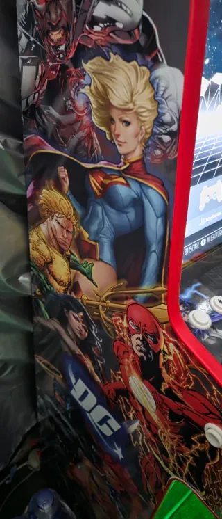 Máquina arcade personalizada con temática de Marvel y DC Comics, lista para horas de diversión. - Controles duales con joysticks y botones. - Iluminación LED verde. - Diseño gráfico de superhéroes en la base. - Con ordenador PC i5, 8gb, SSD crucial 1tb - 110.000 juegos