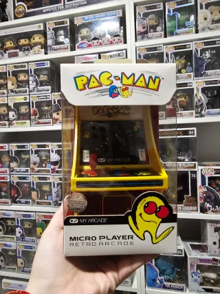 Mini consola portátil de Pac-Man, modelo Micro Player Pro. - Diseño compacto y retro. - Pantalla a color. - Joystick y botones para jugar. - Incluye juego de Pac-Man.