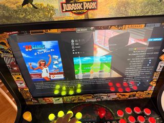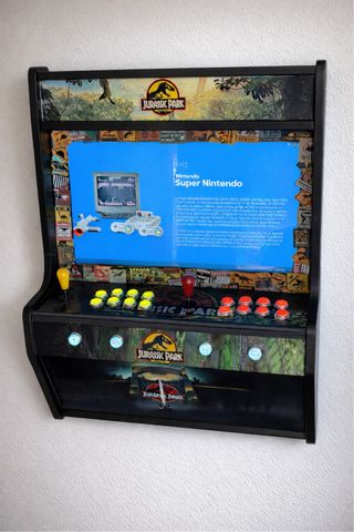 Máquina arcade temática de Jurassic Park, con diseño personalizado. - Pantalla grande con información. - Controles de juego. - Diseño inspirado en la película.
