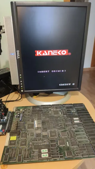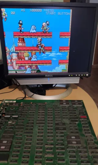 Placa jamma arcade bootleg. Tiene un fallo gráfico en juego. Aparecen unas lineas blancas horizontales, en linea con el campo de juego. No impide jugar con normalidad. Por lo demas, todo funciona correctamente. Se vende con fallo a reparar. No se admite devolución.