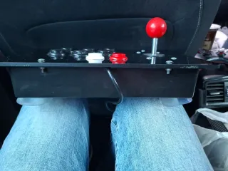 Panel de control para simulador arcade, ideal para proyectos DIY. - Botones de colores (rojo, amarillo, verde, blanco, azul). - Palancas de mando. - Botón de parada de emergencia. - Construcción en tablero de MDF.