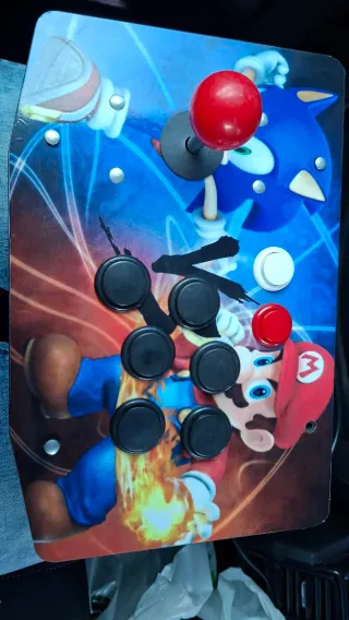 Joystick arcade personalizado con diseño de Mario vs Sonic. - Palanca de mando roja. - Botones de acción negros. - Botones adicionales blancos y rojos. - 6 botones.