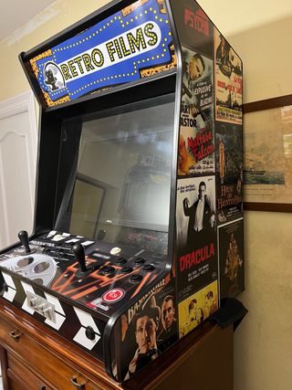 Máquina arcade personalizada con temática de cine clásico. - Diseño Retro Films con carteles de películas icónicas. - Controles de juego arcade. - Pantalla de visualización.