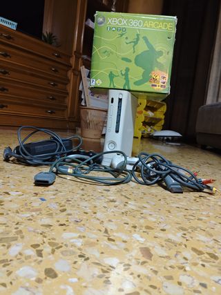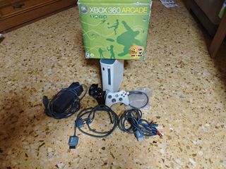 Consola Xbox 360 Arcade en color blanco y gris. - Incluye caja original. - Incluye cables y mando.
