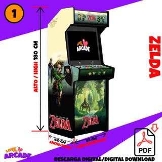 Máquina arcade personalizada con temática de The Legend of Zelda. Ideal para los amantes de los videojuegos retro y la saga. - Diseño inspirado en Zelda. - Panel de control con joysticks y botones. - Pantalla de juego. - Decoración temática en los laterales y frontal.